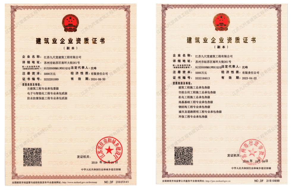 “九層之臺(tái)、起于累土;九尺之堂、始于微末”。江蘇九尺堂建筑工程有限公司自重組以來(lái),經(jīng)歷了數(shù)年的輝煌歷程。公司地處以園林典雅聞名天下的中國(guó)蘇州。集建筑、山水、花木、雕刻、書(shū)畫(huà)等于一體的蘇州文化藝術(shù),成為了九尺堂人孕育靈感與迸發(fā)激情的沃土。